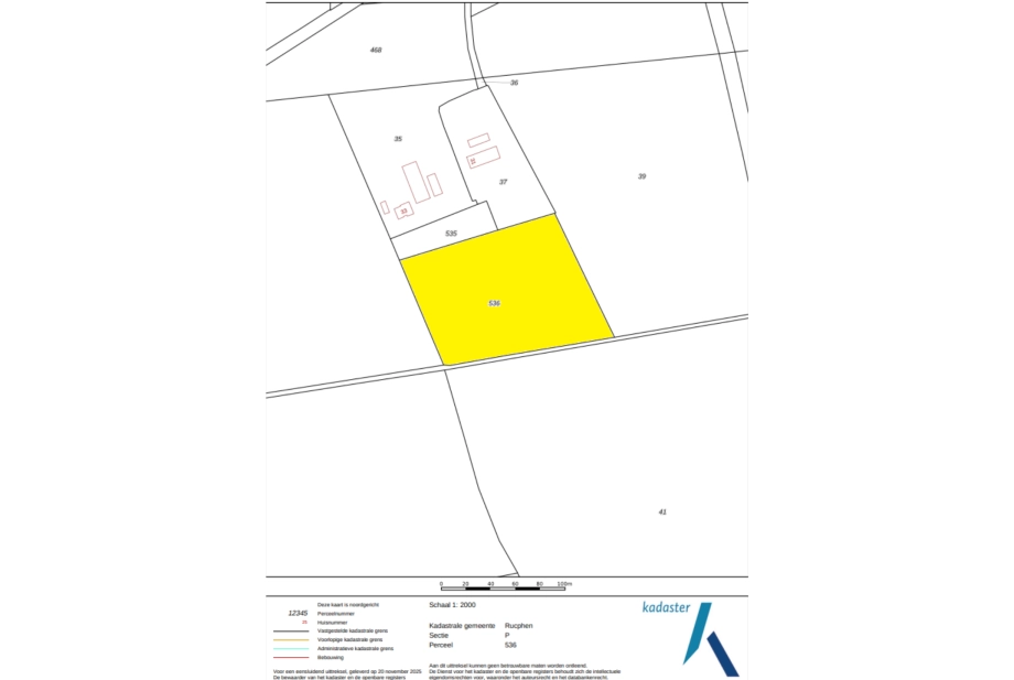 - De kadastrale grenzen zijn niet zichtbaar in het veld en kunnen mogelijk afwijken van de perceelsgrenzen. Indien koper wil weten waar deze kadastrale grenzen exact gelegen zijn zal hij voor eigen rekening deze grenzen moeten laten reconstrueren door het Kadaster.