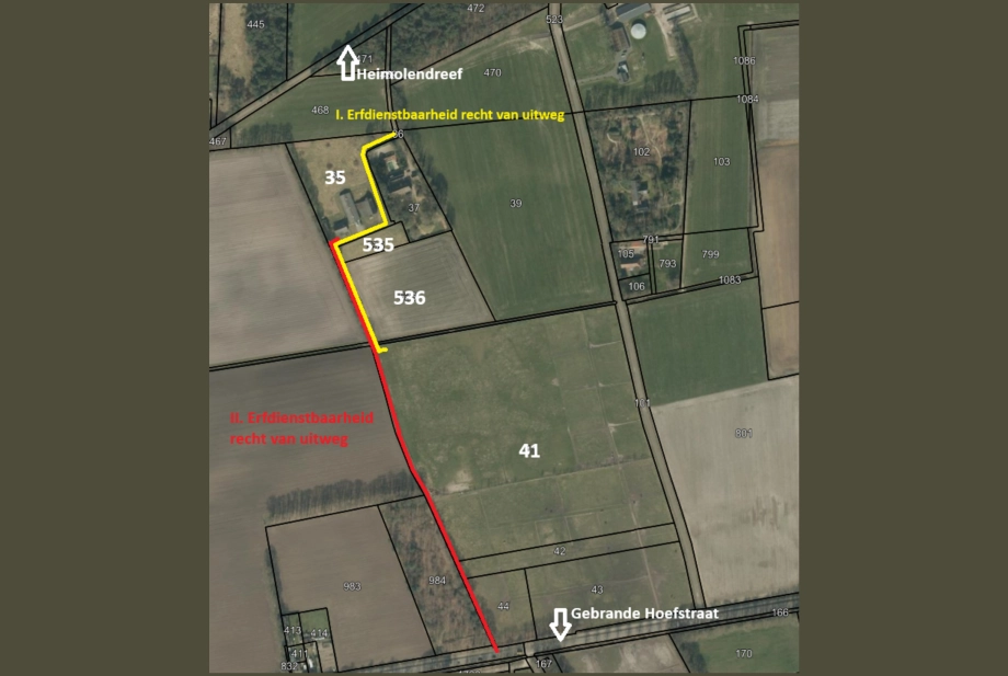 I. Ten behoeve van de percelen kadastraal bekend gemeente Rucphen, sectie P, nummers 41, 535 en 536 en ten laste van perceel kadastraal bekend gemeente Rucphen, sectie P, nummer 35 wordt gehandhaafd het recht van uitweg over de bestaande weg om te komen van en te gaan naar heersende erven over het lijdend erf naar de openbare weg (Heimolendreef);