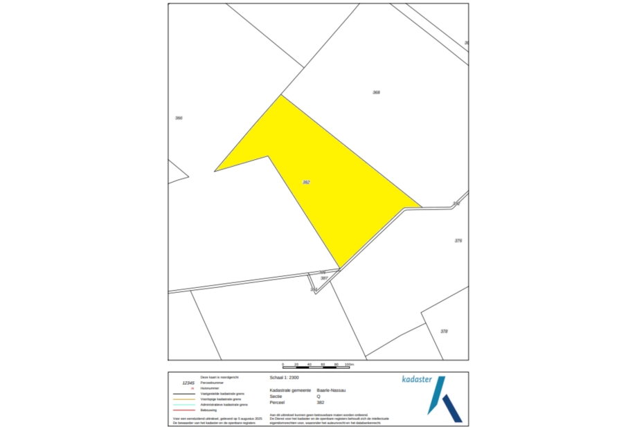 - De kadastrale grenzen zijn niet zichtbaar in het veld en kunnen mogelijk afwijken van de perceelsgrenzen. Indien koper wil weten waar deze kadastrale grenzen exact gelegen zijn zal hij voor eigen rekening deze grenzen moeten laten reconstrueren door het Kadaster.